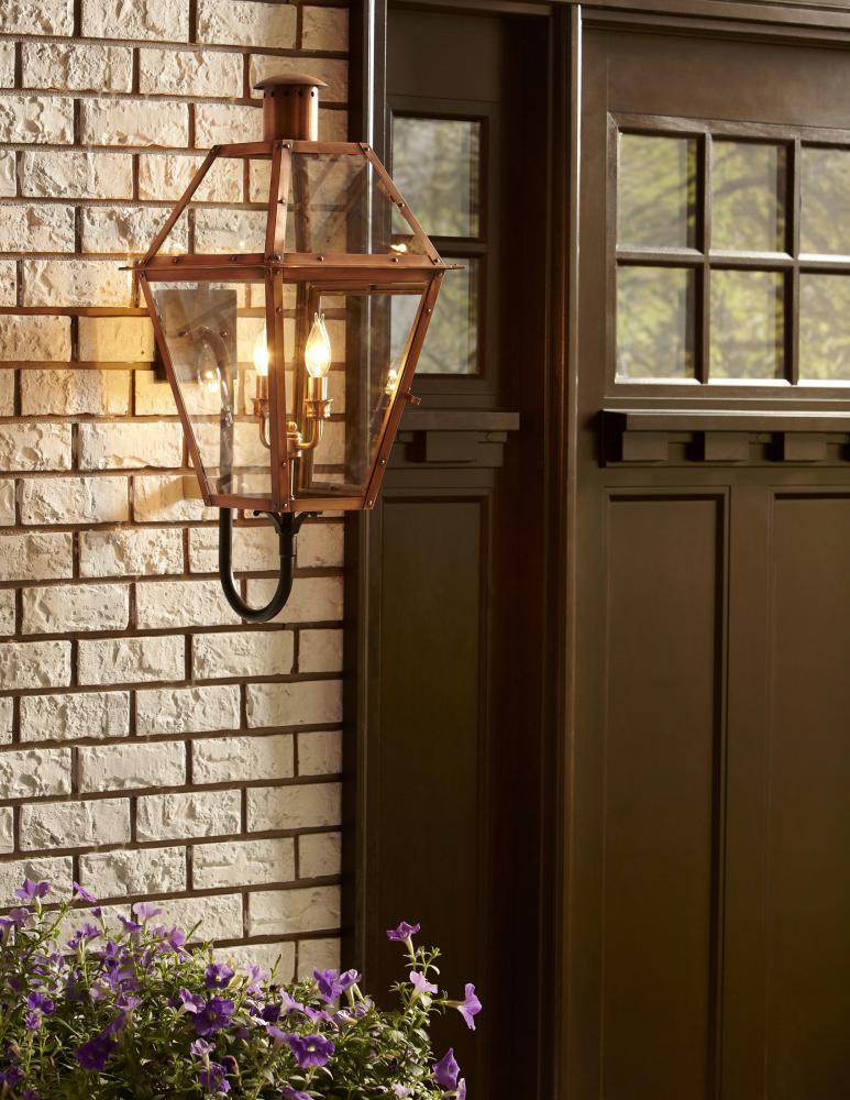 From the Charleston Copper Lantern Collection this piece gives you the historic look of gas lighting but without the hassle of a propane feed. It is all electric solid copper and hand riveted giving your home the romantic reproduction style of antiqu