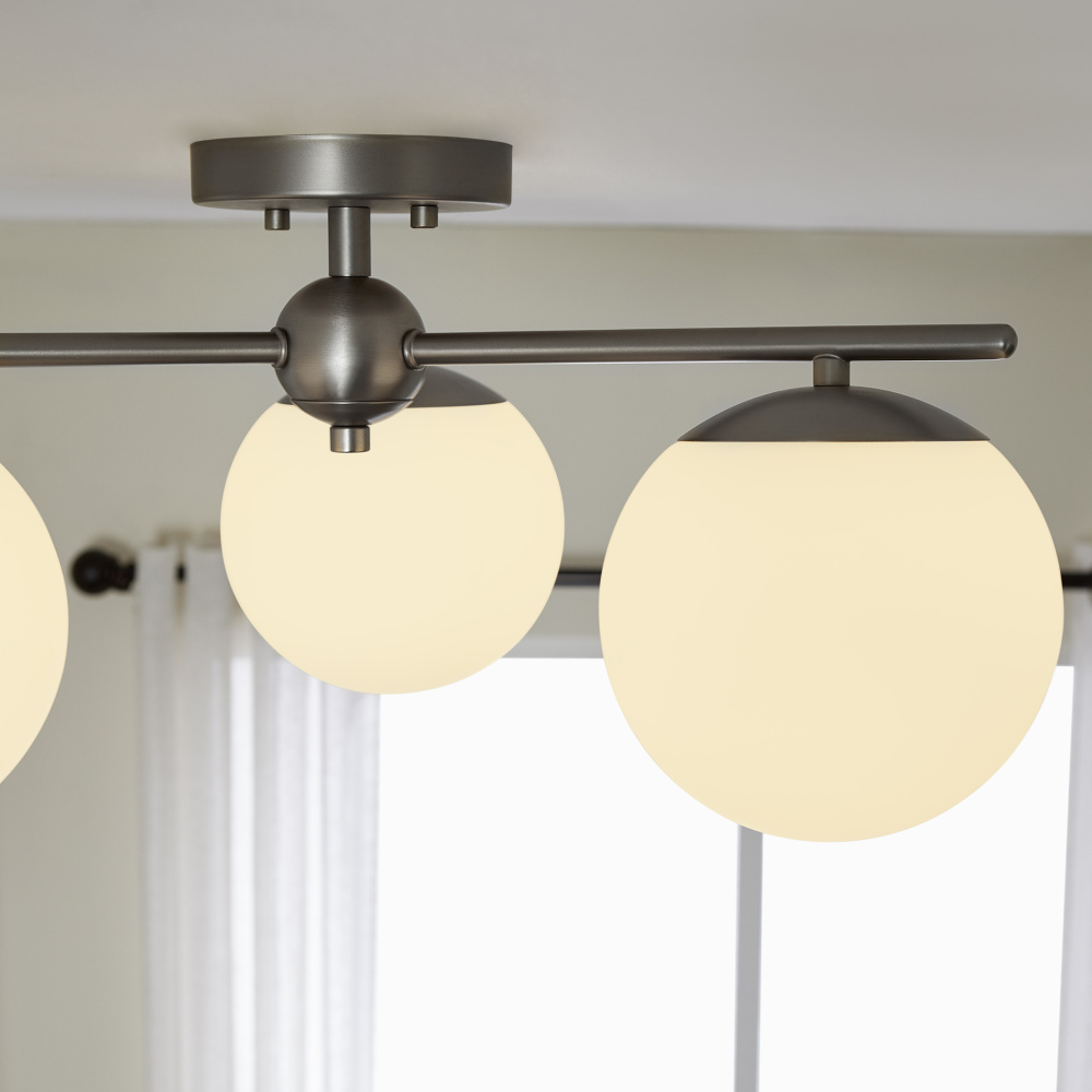 Part of the Main Street collection, the Jasper collection showcases a modern hub-and-spoke design with round globe shades and clean symmetry. Available in matte black or satin nickel and offered in both 3-light and 6-light configurations, it’s designed to suit a range of modern interiors.