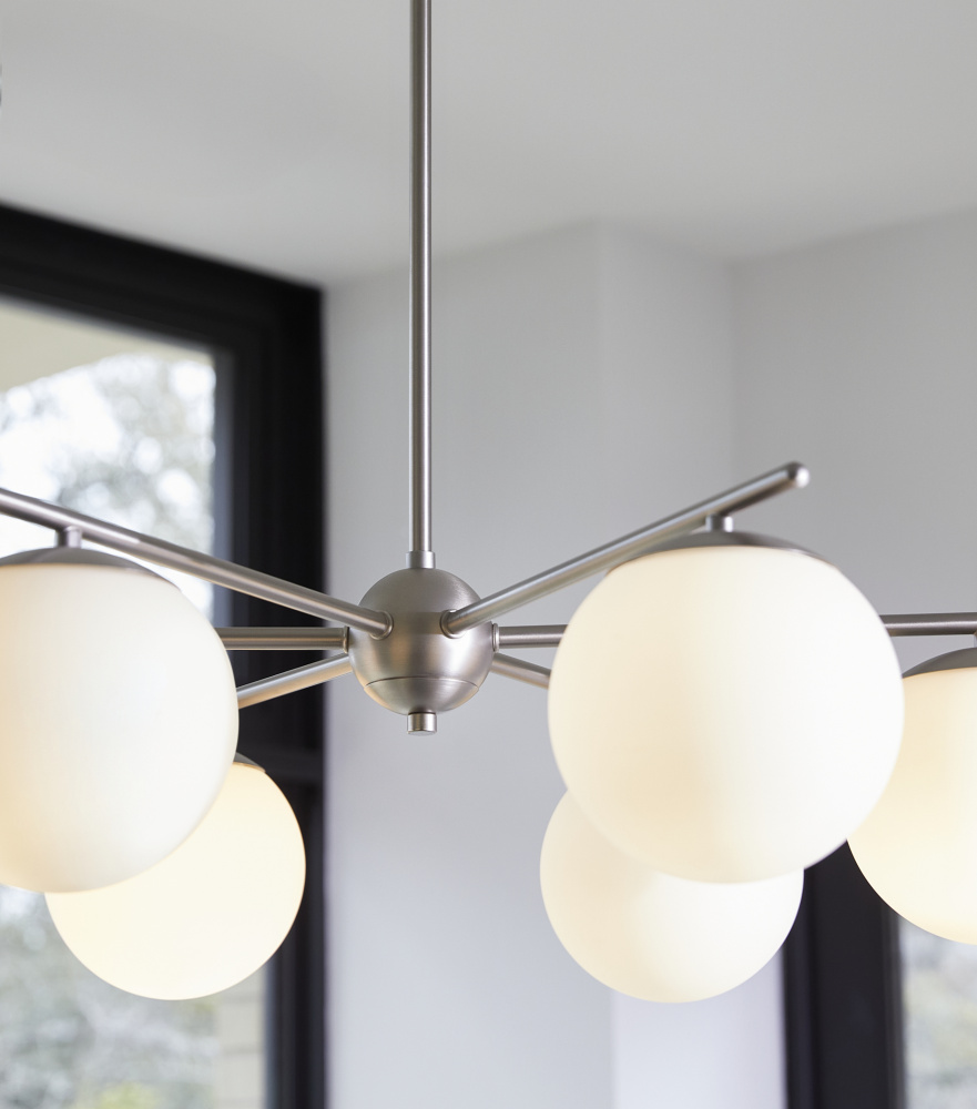 Part of the Main Street collection, the Jasper collection showcases a modern hub-and-spoke design with round globe shades and clean symmetry. Available in matte black or satin nickel and offered in both 3-light and 6-light configurations, it’s designed to suit a range of modern interiors.