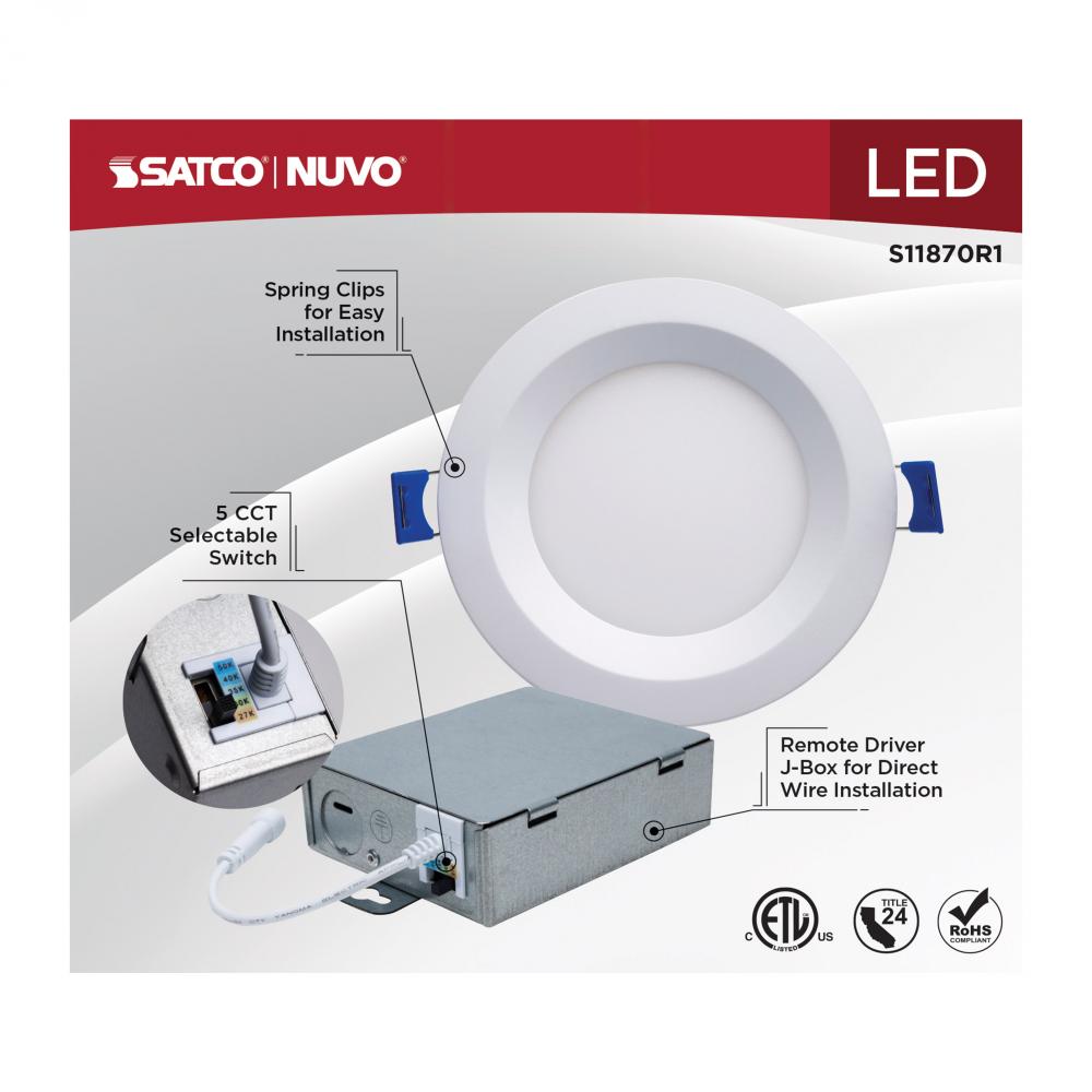 SATCO NUVO's low-profile regress baffle downlights combine performance, versatility, and ease of installation. Available in 4" and 6" sizes with both round and square trim options, they feature 5 CCT selectable settings (2700K–5000K) to accom