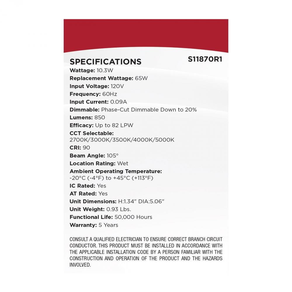 SATCO NUVO's low-profile 4" round regress baffle downlight, S11870R1, combines performance, versatility, and ease of installation. It features 5 CCT selectable settings (2700K–5000K) to accommodate a wide range of lighting preferences, while the