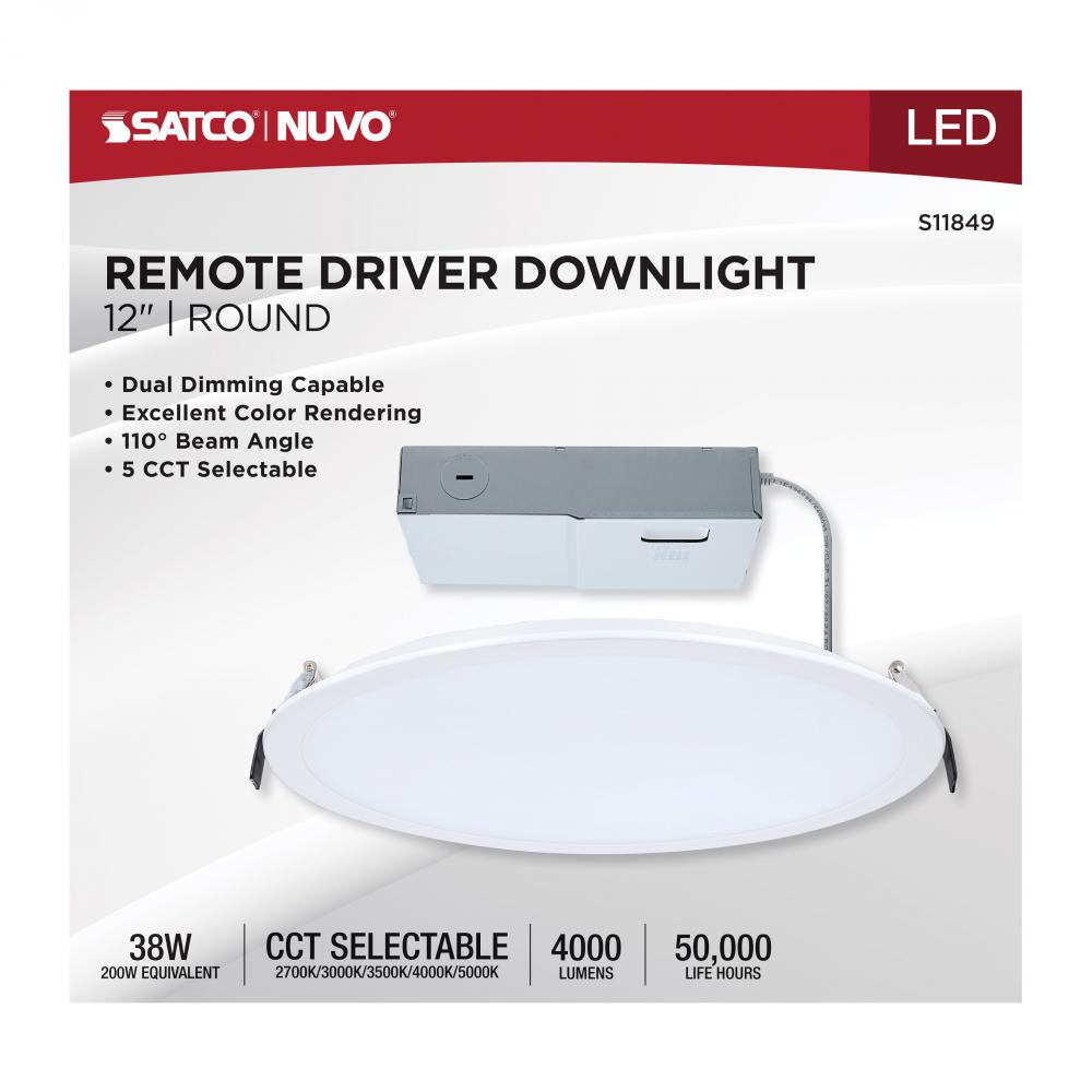 38 Watt; 12 Inch LED Direct Wire Downlight; Remote Driver; CCT Selectable; Dual Dimming; Flat Face;