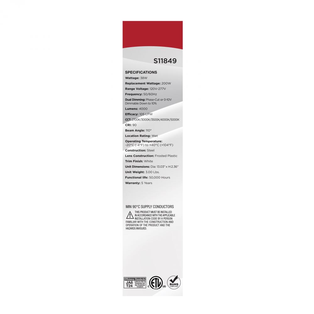 SATCO NUVO's S11849 LED Slimfit Downlights offer exceptional versatility and performance, and these models feature a wide 12-inch diameter to illuminate larger spaces. ColorQuick Technology allows for the selection from five CCT choices at installation