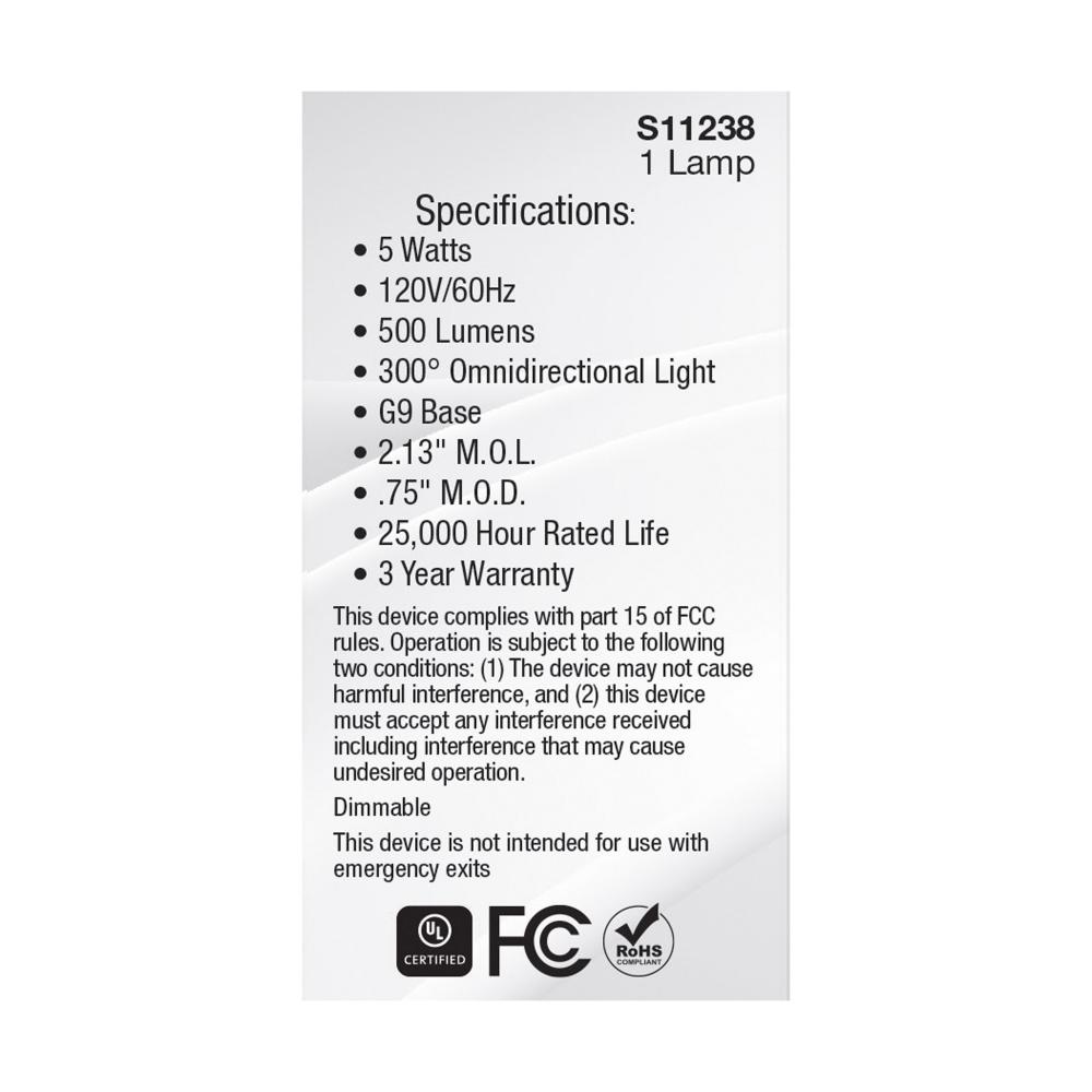 Transform your surroundings with SATCO NUVO's S11238 5-watt, T4, G9-base, Halogen replacement lamp, engineered for optimal energy efficiency and affordability. With a CCT of 2700K and emitting a 300-degree omni-directional light, this lamp is ideal for