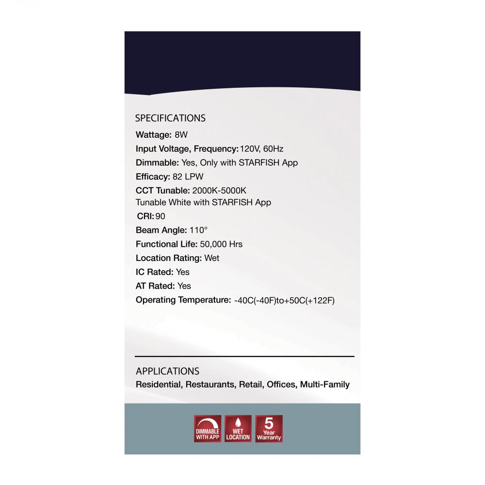 SATCO NUVO'S LED Retrofit Downlights with STARFISH technology are the ultimate choice for smart lighting and ambiance control. Download the STARFISH app to customize any tunable white color temperatures from 2000K warm white light to 5000K natural ligh