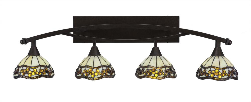 Toltec Lighting 174-BRZ-9975 Bow 4 Light Bath Bar Shown In Bronze Finish with 7 Roman Jewels Art Glass