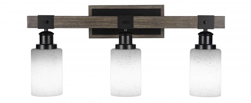 Toltec Lighting 1843-MBDW-310 Tacoma 3 Light Bath Bar Shown In Matte Black & Painted Distressed Wood-look Metal With 4? White Muslin Glass