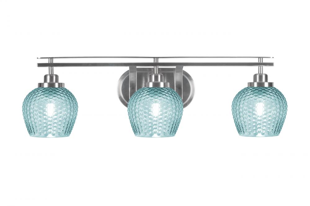 Odyssey 3 Light Bath Bar Shown In Brushed Nickel Finish With 6 Turquoise Textured Glass