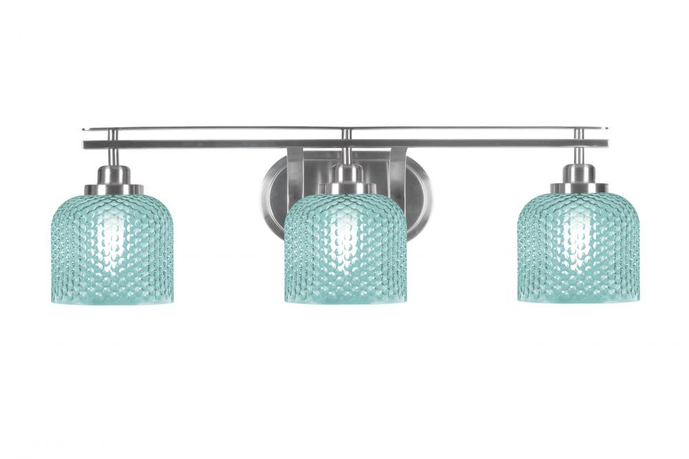 Odyssey 3 Light Bath Bar Shown In Brushed Nickel Finish With 6 Turquoise Textured Glass