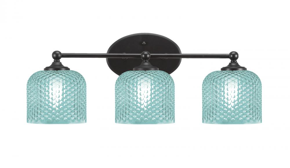 Capri 3 Light Bath Bar Shown In Matte Black Finish With 6 Turquoise Textured Glass