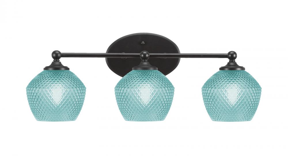 Capri 3 Light Bath Bar Shown In Matte Black Finish With 6 Turquoise Textured Glass