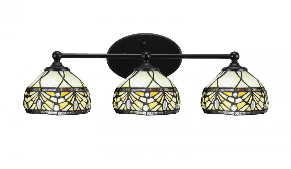 Capri 3 Light Bath Bar Shown In Matte Black Finish With 7 Royal Merlot Art Glass