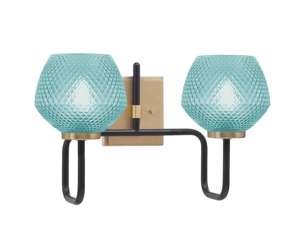 Sandia 2 Light Bath Bar, Matte Black & New Age Brass Finish, 6 Turquoise Textured Glass