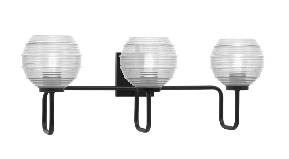 Sandia 3 Light Bath Bar, Matte Black Finish, 6 Clear Ribbed Glass