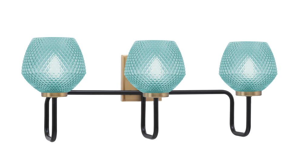 Sandia 3 Light Bath Bar In Matte Black & New Age Brass Finish, 6 Turquoise Textured Glass