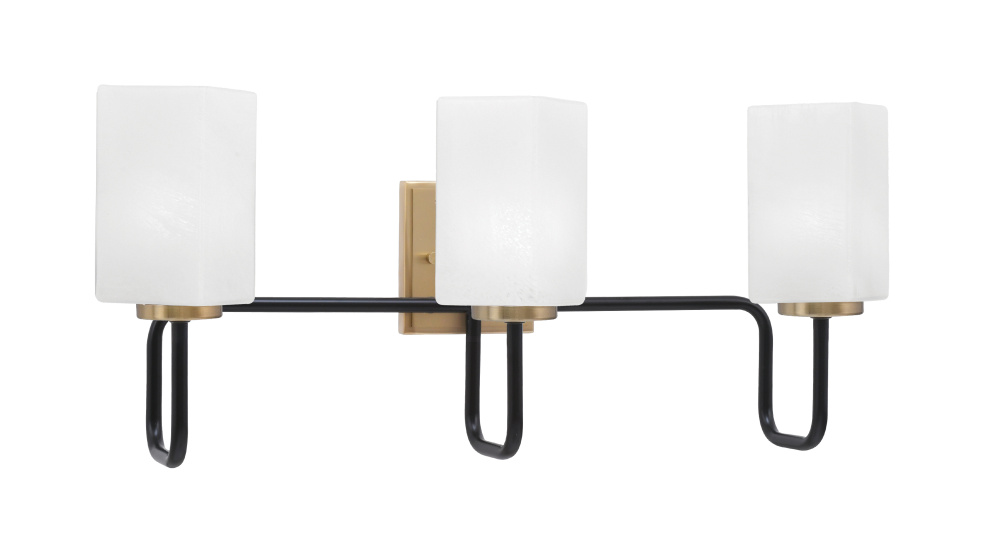 Sandia 3 Light Bath Bar In Matte Black & New Age Brass Finish, 3.5 Square White Marble Glass