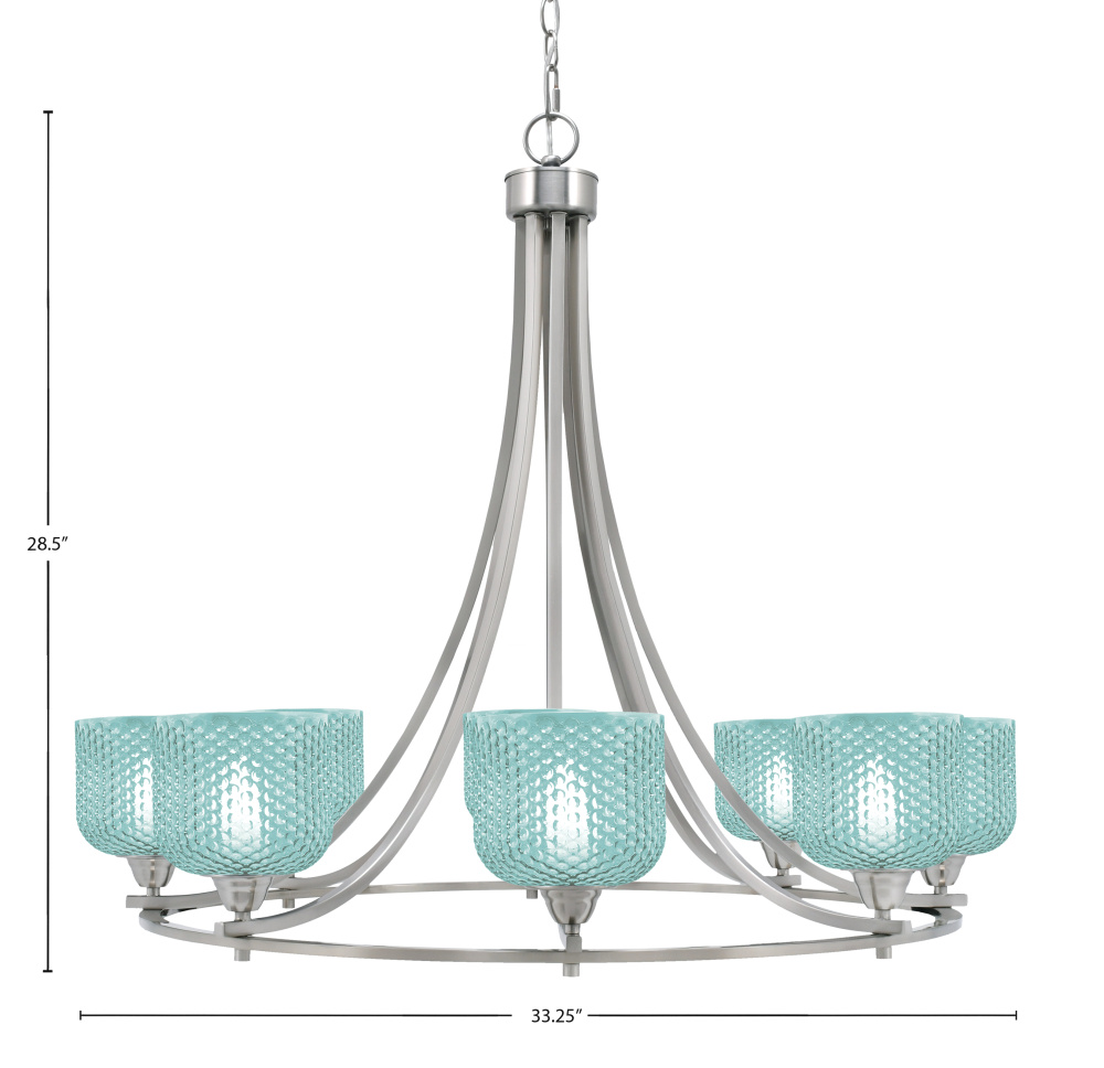 Paramount 8 Light Uplight Chandelier Shown In Brushed Nickel Finish With 6 Turquoise Textured Glass