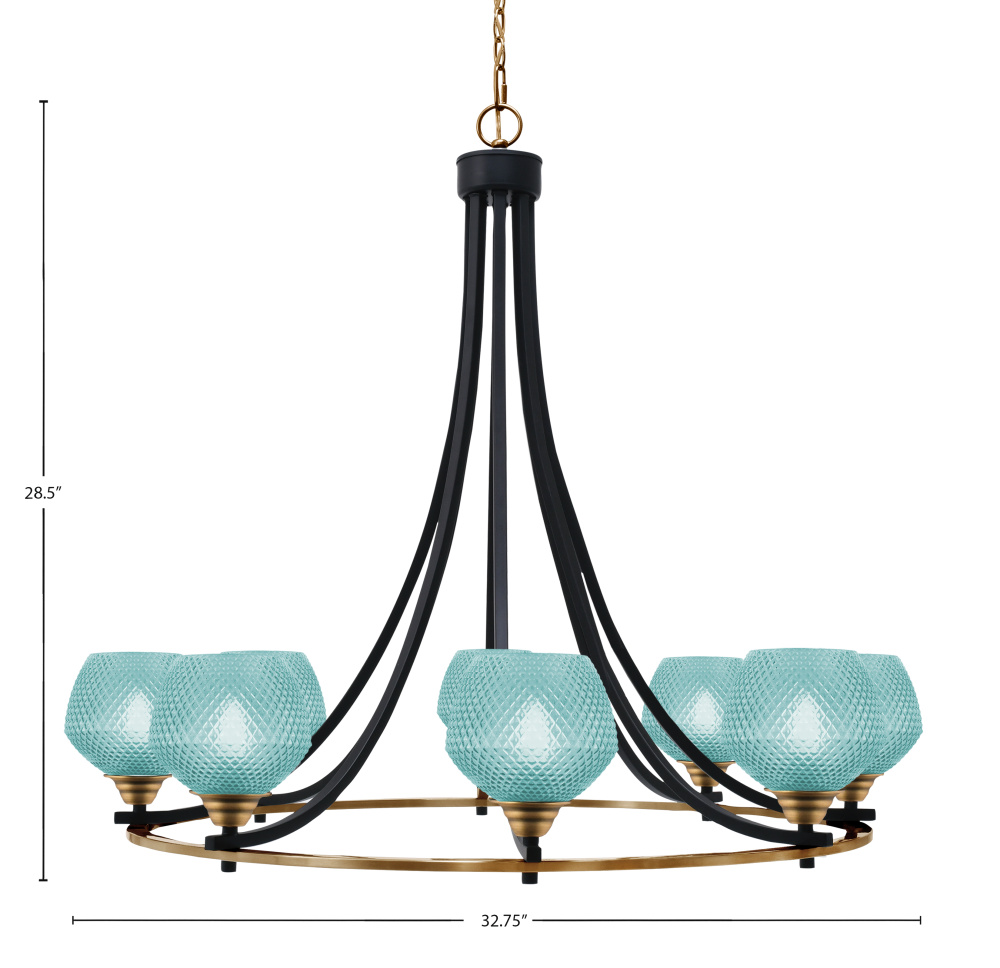 Paramount 8 Light Uplight Chandelier Shown In Matte Black & Brass Finish With 6 Turquoise Textured Glass