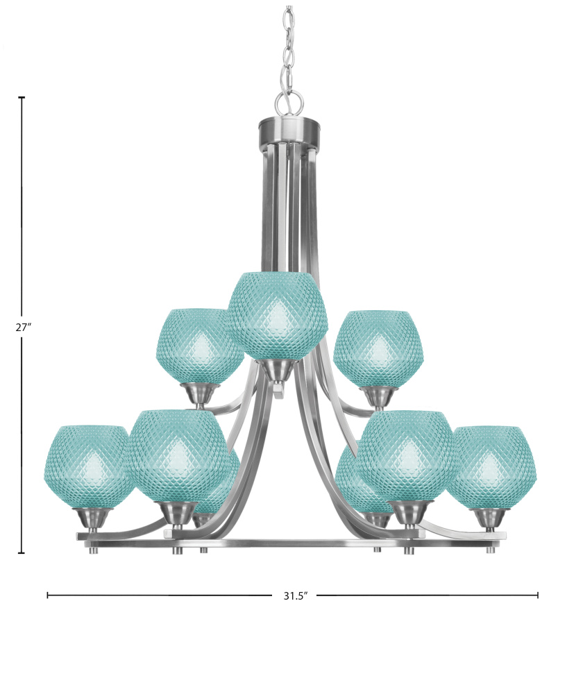 Paramount 9 Light Uplight Chandelier Shown In Brushed Nickel Finish With 6 Turquoise Textured Glass
