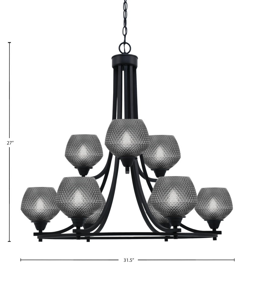Paramount 9 Light Uplight Chandelier Shown In Matte Black Finish With 6 Smoke Textured Glass