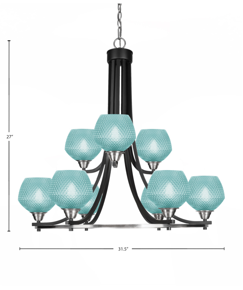 Paramount 9 Light Uplight Chandelier Shown In Matte Black & Brushed Nickel Finish With 6 Turquoise Textured Glass