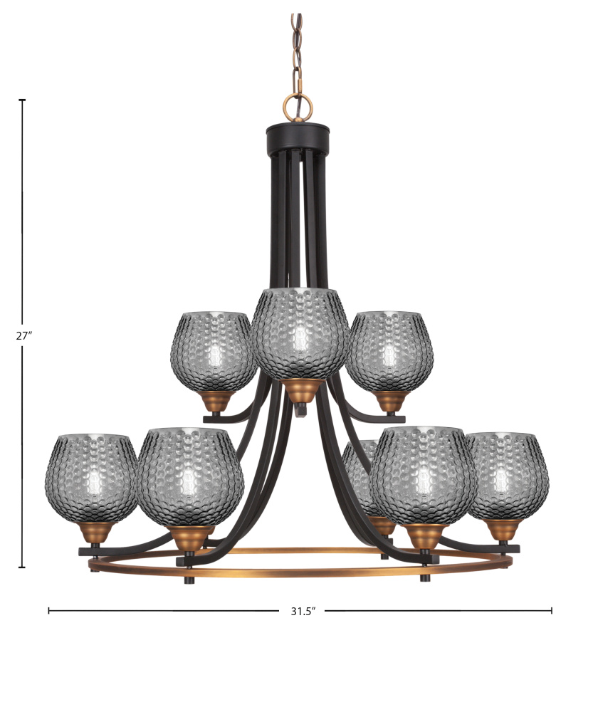 Paramount 9 Light Uplight Chandelier Shown In Matte Black & Brass Finish With 6 Smoke Textured Glass