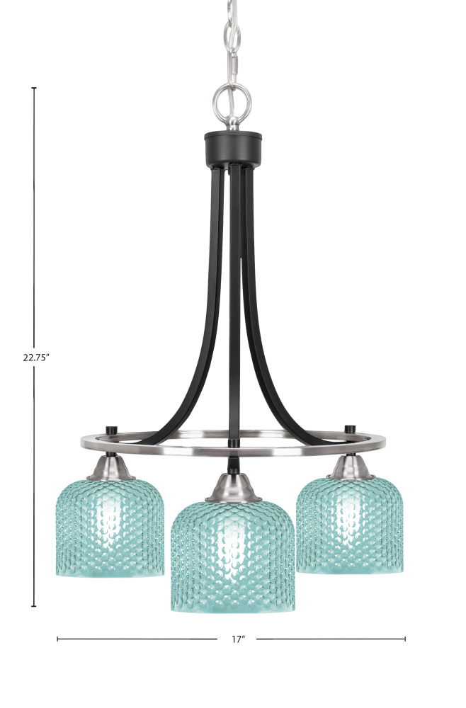 Paramount 3 Light Downlight Chandelier Shown In Matte Black & Brushed Nickel Finish With 6 Turquoise Textured Glass
