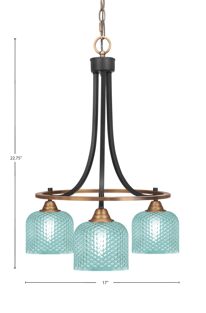 Paramount 3 Light Downlight Chandelier Shown In Matte Black & Brass Finish With 6 Turquoise Textured Glass