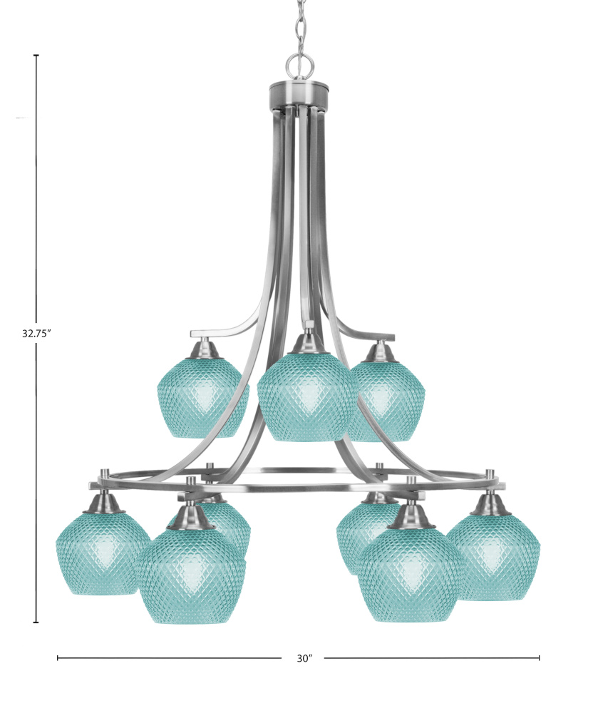 Paramount 9 Light Downlight Chandelier Shown In Brushed Nickel Finish With 6 Turquoise Textured Glass