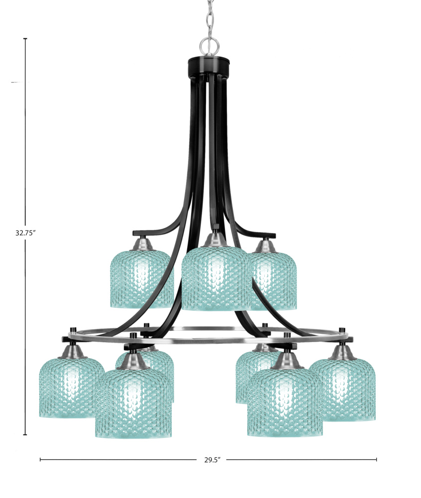 Paramount 9 Light Downlight Chandelier Shown In Matte Black & Brushed Nickel Finish With 6 Turquoise Textured Glass