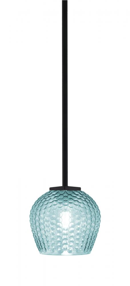 Franklin Stem Hung Mini Pendant Shown In Matte Black Finish With 6 Turquoise Textured Glass