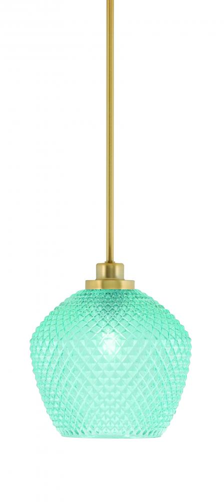 Odyssey Stem Hung Mini Pendant Shown In New Age Brass Finish With 9 Turquoise Textured Glass