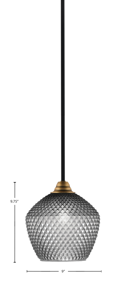 Paramount Stem Hung Mini Pendant Shown In Matte Black & Brass Finish With 9 Smoke Textured Glass