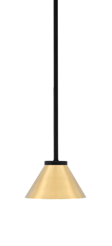 Sandia 1 Light Stem Mini Pendant, Matte Black Finish, 7 New Age Brass Cone Metal Shade