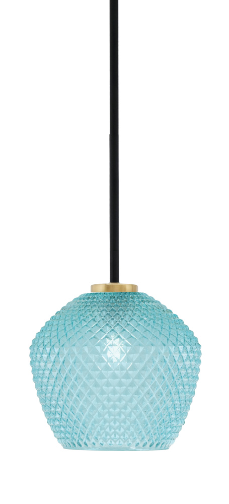 Sandia 1 Light Stem Mini Pendant, Matte Black & New Age Brass Finish, 9 Turquoise Textured Glass