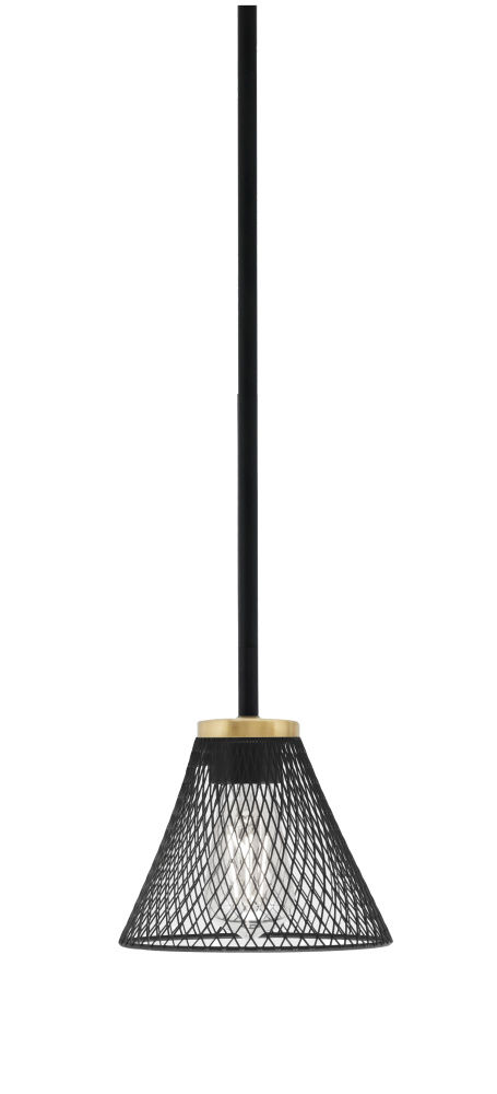 Sandia 1 Light Stem Mini Pendant, Matte Black & New Age Brass Finish, 7 Matte Black Cone Mesh Metal Shade