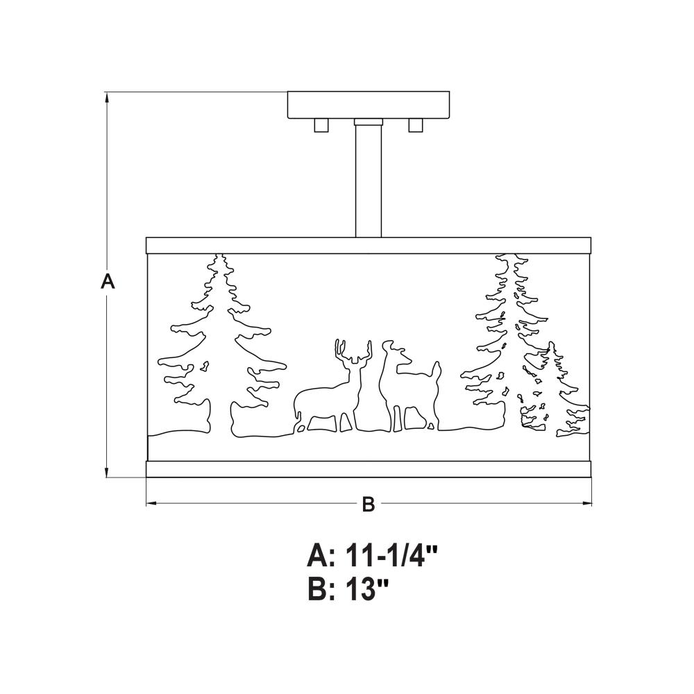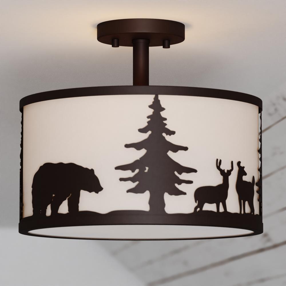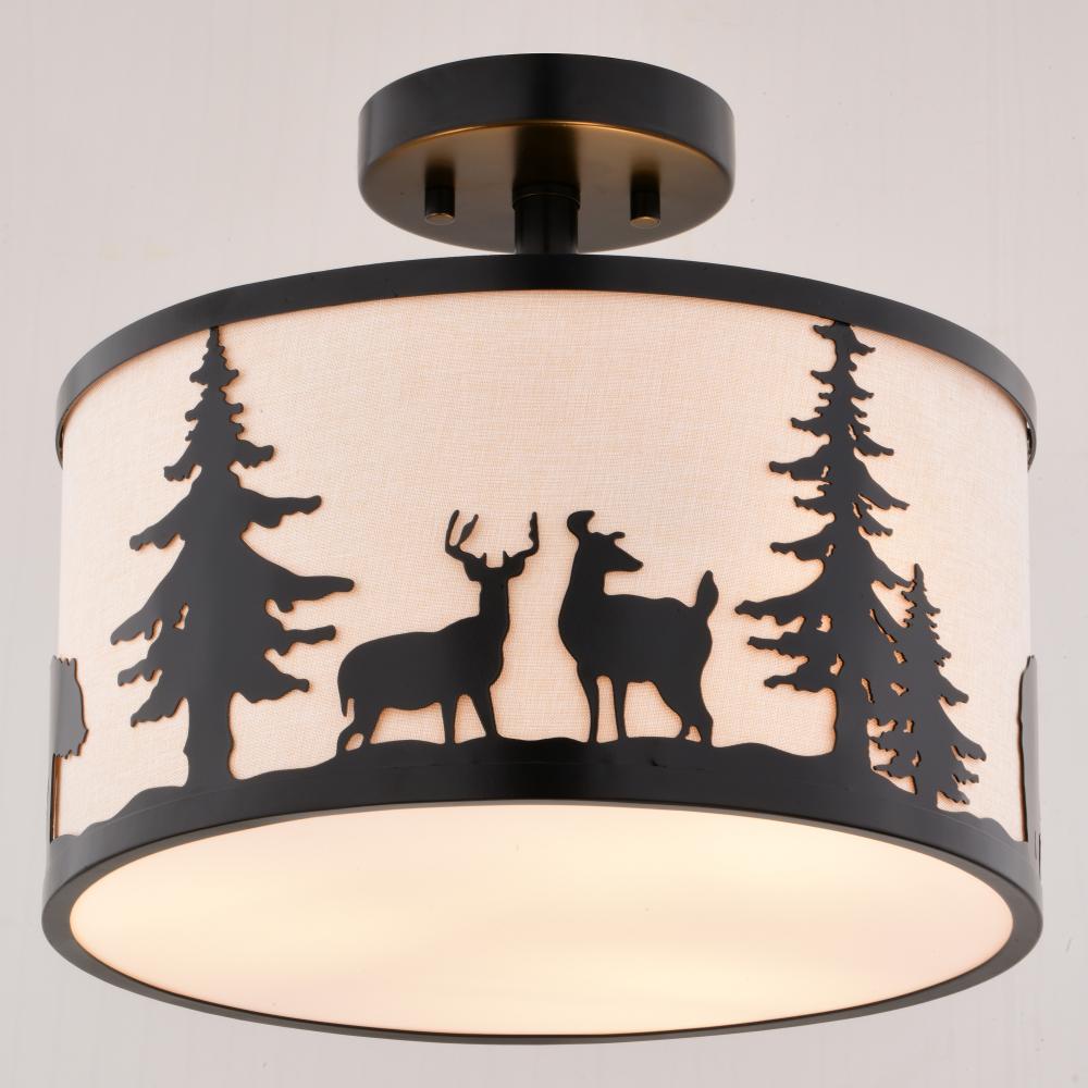 Embrace the serene whispers of the artfully crafted Acadia semi-flush ceiling light to bring the essence of the wild into your home. The Acadia's three lights and textured linen drum shade showcase bear and deer silhouettes set against a backdrop of evergreen trees. Perfect for kitchens or family rooms of cabins, lodges, or any home seeking to add a touch of nature and rustic ambiance.