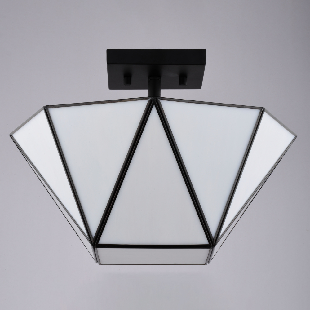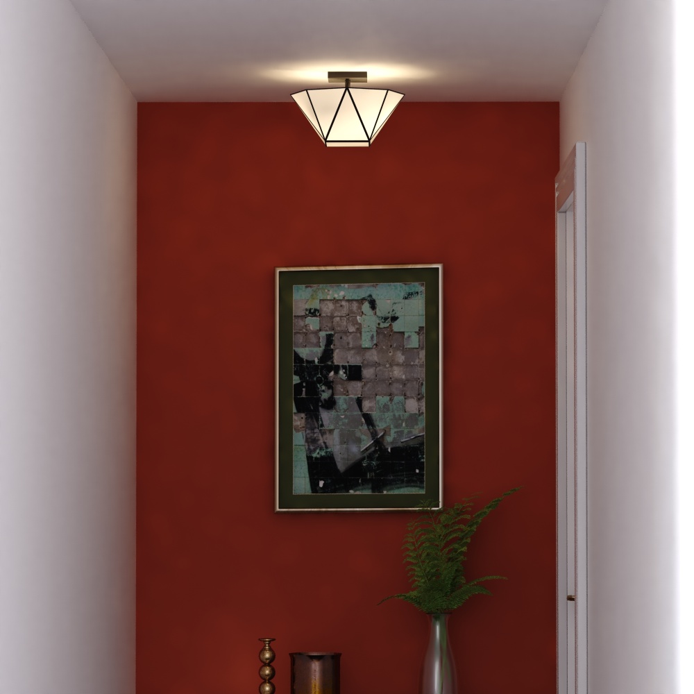 Add a touch of retro-chic style to your home with the Burnett 14-inch semi-flush mount light. This eye-catching fixture combines mid-century modern design with unique Tiffany-style glass panels, creating a statement piece that elevates any space. The geometric cage design adds a touch of visual interest, while the soft, opal glass shade provides a warm and inviting glow. Ideal for bedrooms, hallways, entryways, or smaller dining rooms, this ceiling light fixture offers a stylish and practical lighting solution for any space.