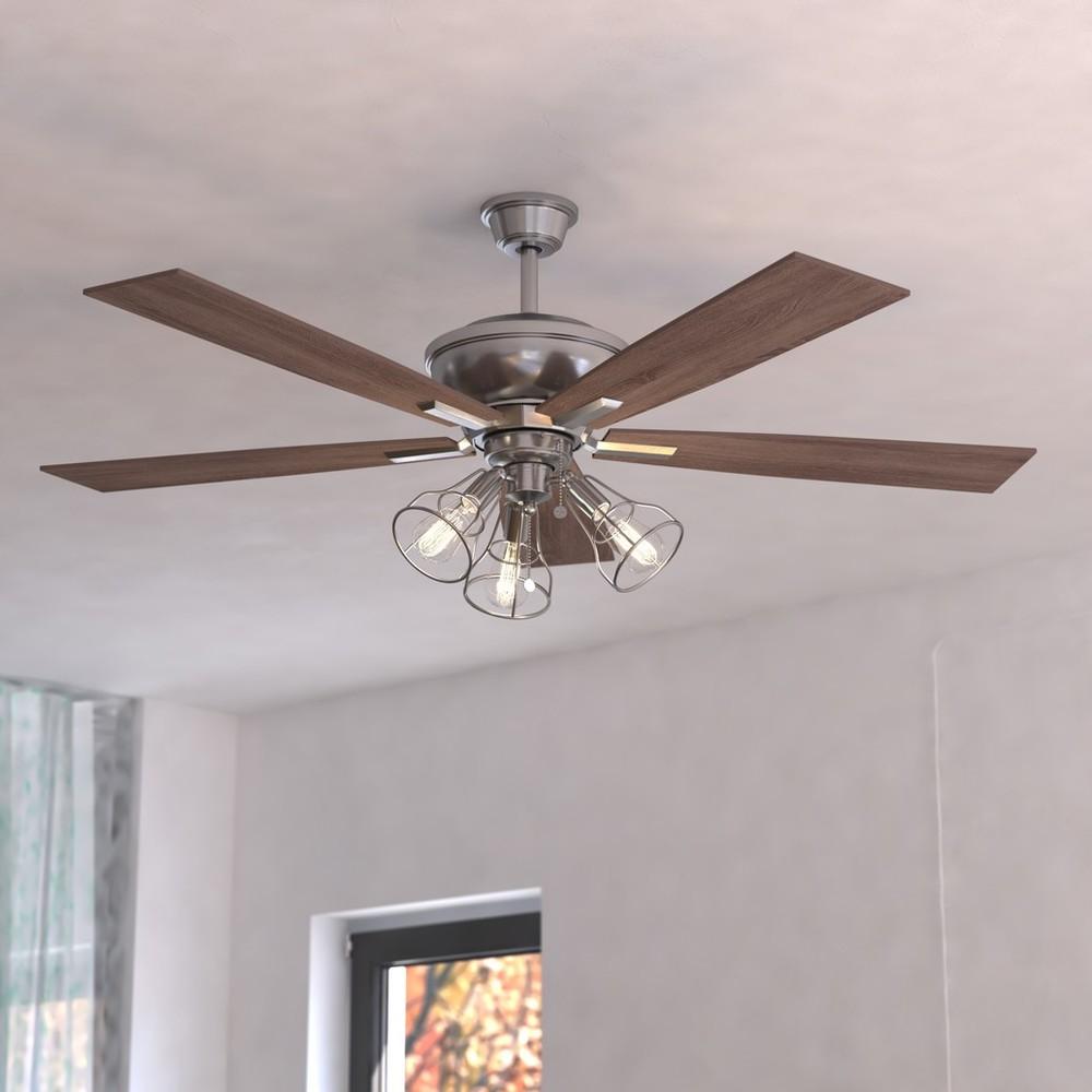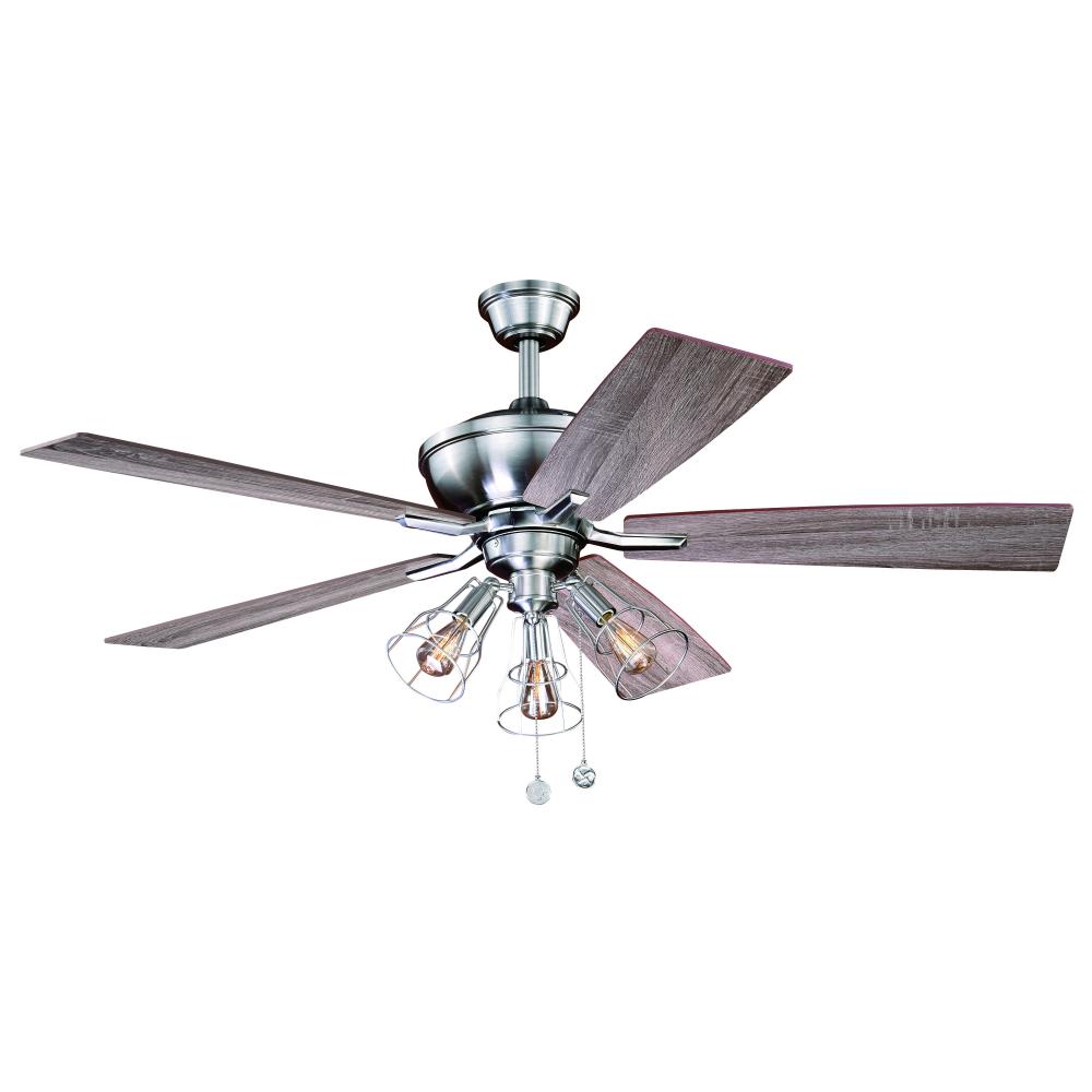 The Clybourn ceiling fan in a satin nickel finish has a distinct farmhouse or industrial look. The included light kit features 3 distinct wire cage directional lights over dimmable vintage Edison style filament bulbs (included). Attractive reversible driftwood or walnut blades allow you to change up the look. A pull chain makes it easy to control the speeds. This fan is perfect for any living room, kitchen, or office. Can be alternatively installed without the light kit. It is compatible with sloped ceilings and includes a 6 inch down rod (longer down rods sold separately).