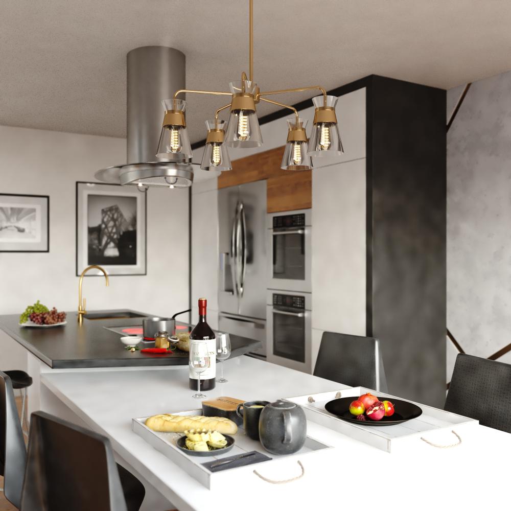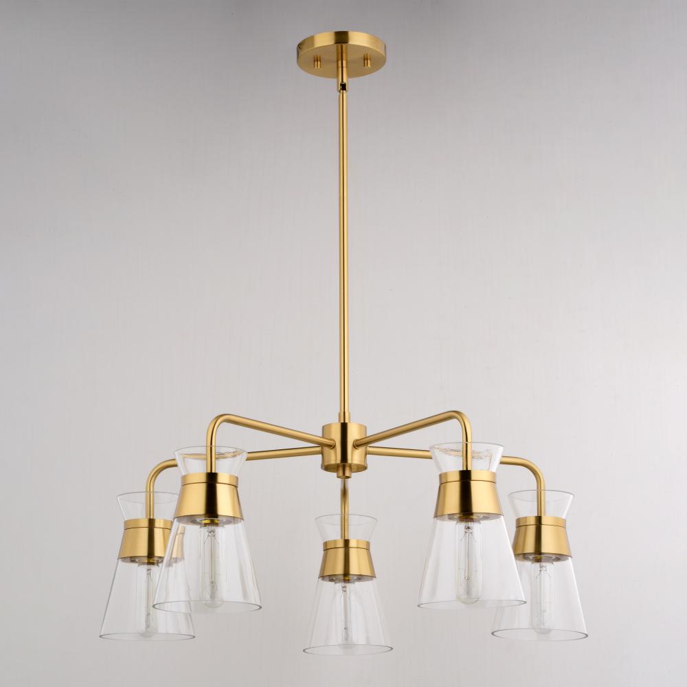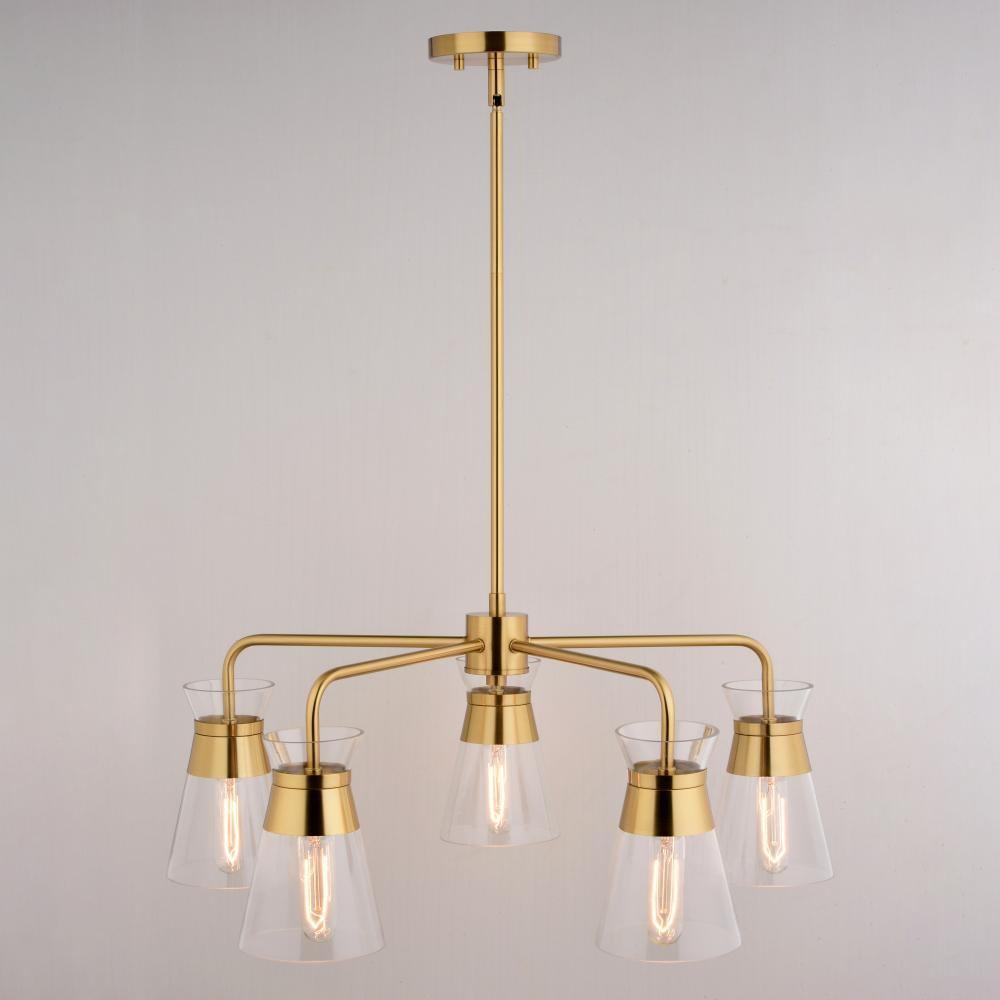 Indulge in mid-century modern charm with the Harper 5 Light Chandelier. Its sleek, bowtie-inspired design and natural brass finish bring a touch of warmth and sophistication to your dining room, living room, or foyer. The clear glass shade beautifully showcases your choice of bulb, creating a captivating focal point.