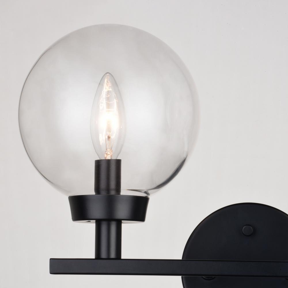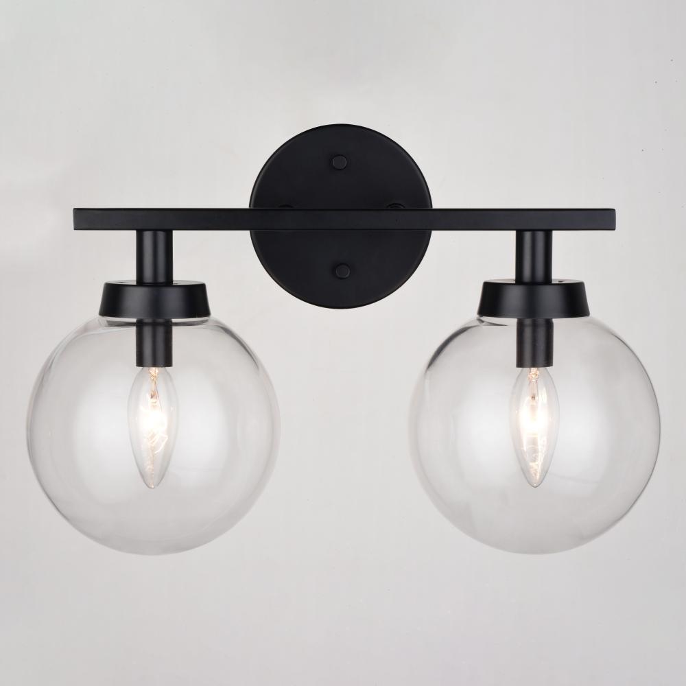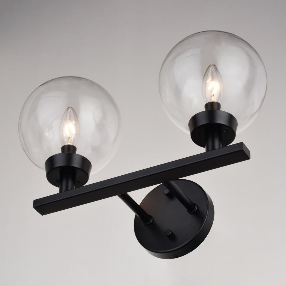 The Lander collection of interior lighting is contemporary style with flair. Distinctive metal arms finished in matte black support and highlight the round clear glass globes. This vanity light is a perfect addition to your bathroom, hallway, kitchen or any other living area where a little extra style is desired.