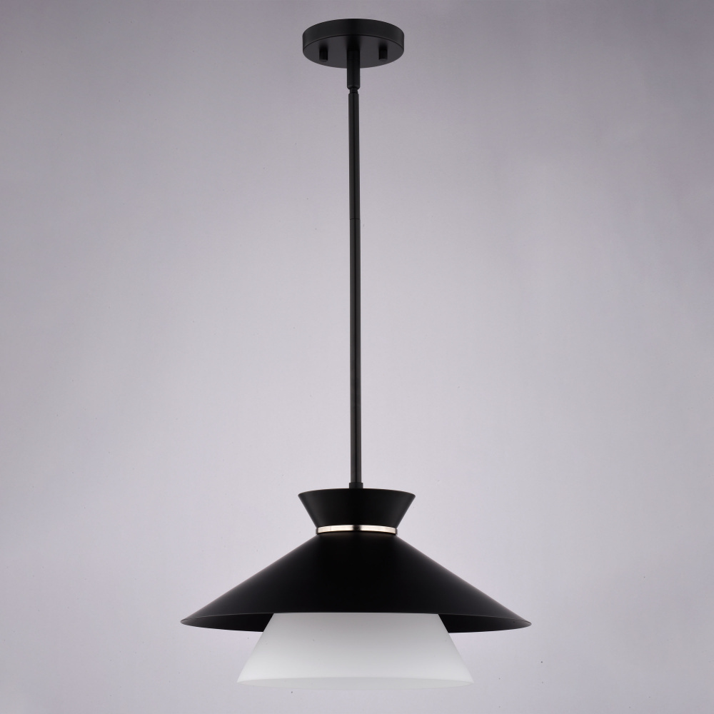 Bring iconic mid-century modern design to your dining area or kitchen island with the Loomis pendant. Its streamlined matte black finish and frosted opal glass shade cast a warm, inviting glow, perfect for homeowners seeking a stylish yet simple ceiling light fixture. The classic bowtie design adds a touch of retro charm, creating a focal point that complements both contemporary and transitional interiors offering a flexible lighting solution for your evolving taste.