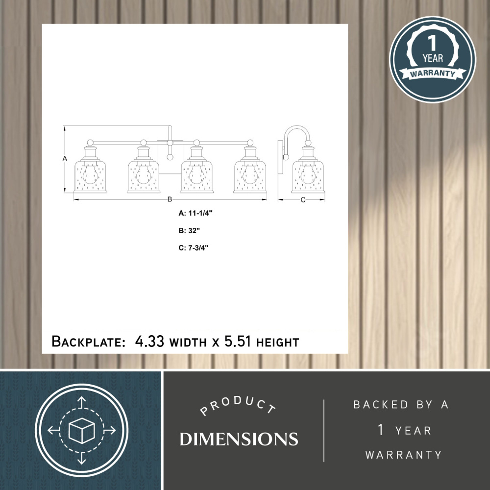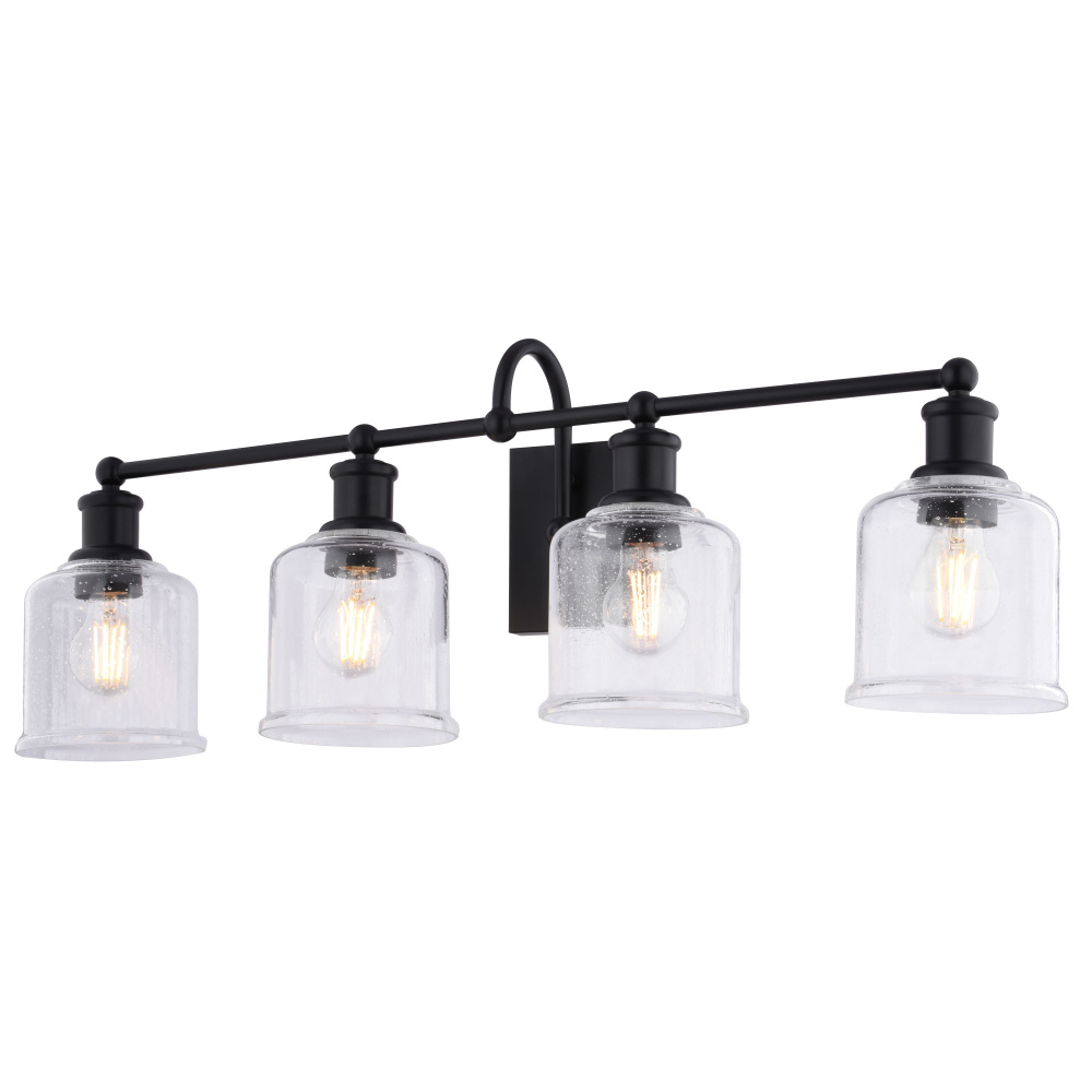 Embrace the charm of cottage core aesthetics with the Northbrook 4-light vanity in a sophisticated matte black finish. The clear seeded glass shades diffuse a warm, inviting light, perfect for creating a cozy and welcoming bathroom ambiance. This wider 32-inch wall fixture design provides ample illumination for larger vanities, while the classic silhouette and traditional details effortlessly complement farmhouse and classic interiors. The damp-rated design ensures lasting beauty, while bringing a touch of vintage elegance and timeless sophistication to your daily routine.