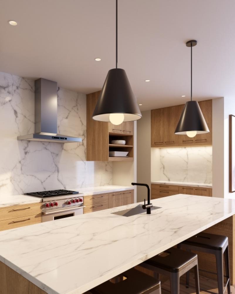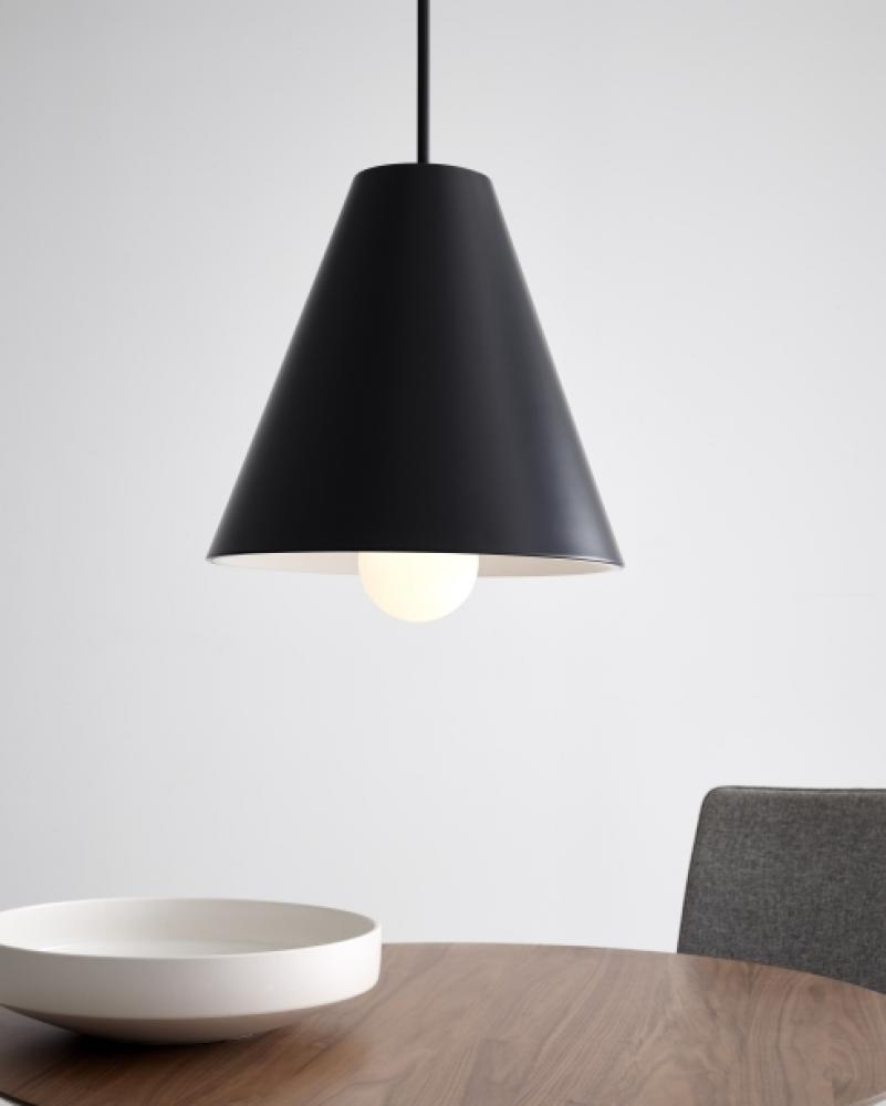 An integrated LED lamp is suspended within a conical shade and creates a uniquely contemporary pendant