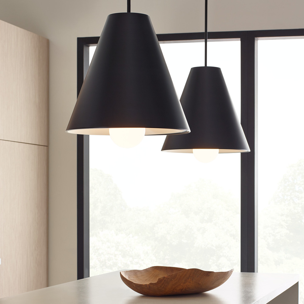 Joni Pendant by Sean Lavin for Visual Comfort Modern features an integrated LED lamp suspended within a conical shade and creates a uniquely contemporary fixture. Designed for heightened visual interest with two-tone finish options, Joni is offered in multiple finish combinations, with all finishes having a Matte White inner reflector. At 17” in diameter, the Joni Pendant is a subtle contemporary statement piece great for your kitchen, living room, hallway and bedroom. Complete the look with the Joni Wall Sconce, Flush Mount and smaller scale Low-Voltage Pendant. Lamping options are compatible with most dimmers. Refer to the Dimming Chart for more information.