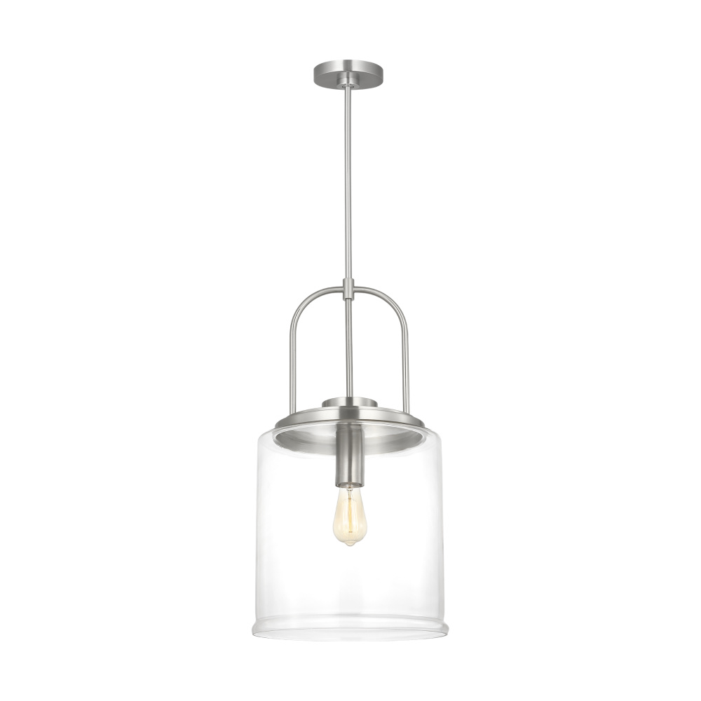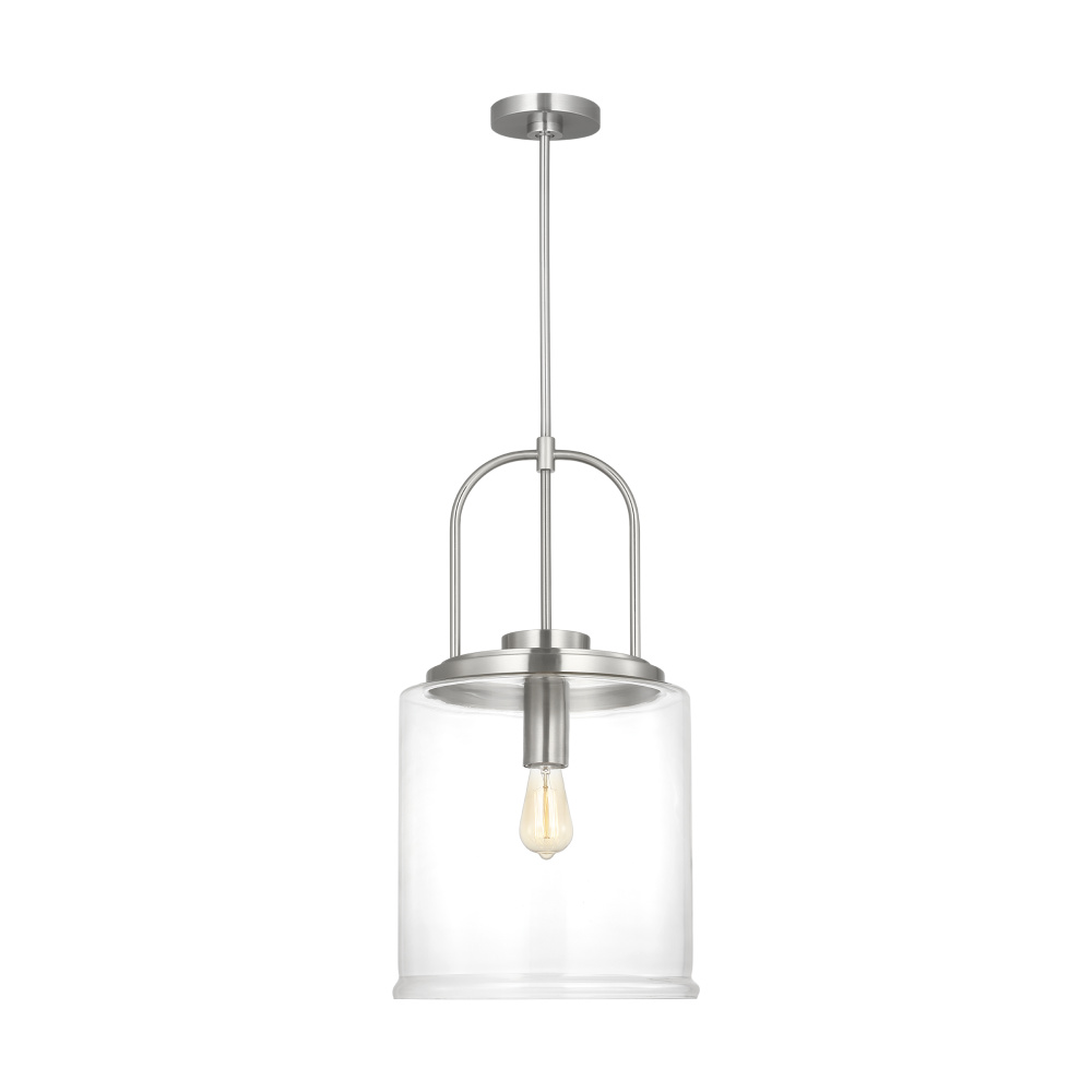 Crafted with Steel in a Brushed Nickel finish with clear glass shade
