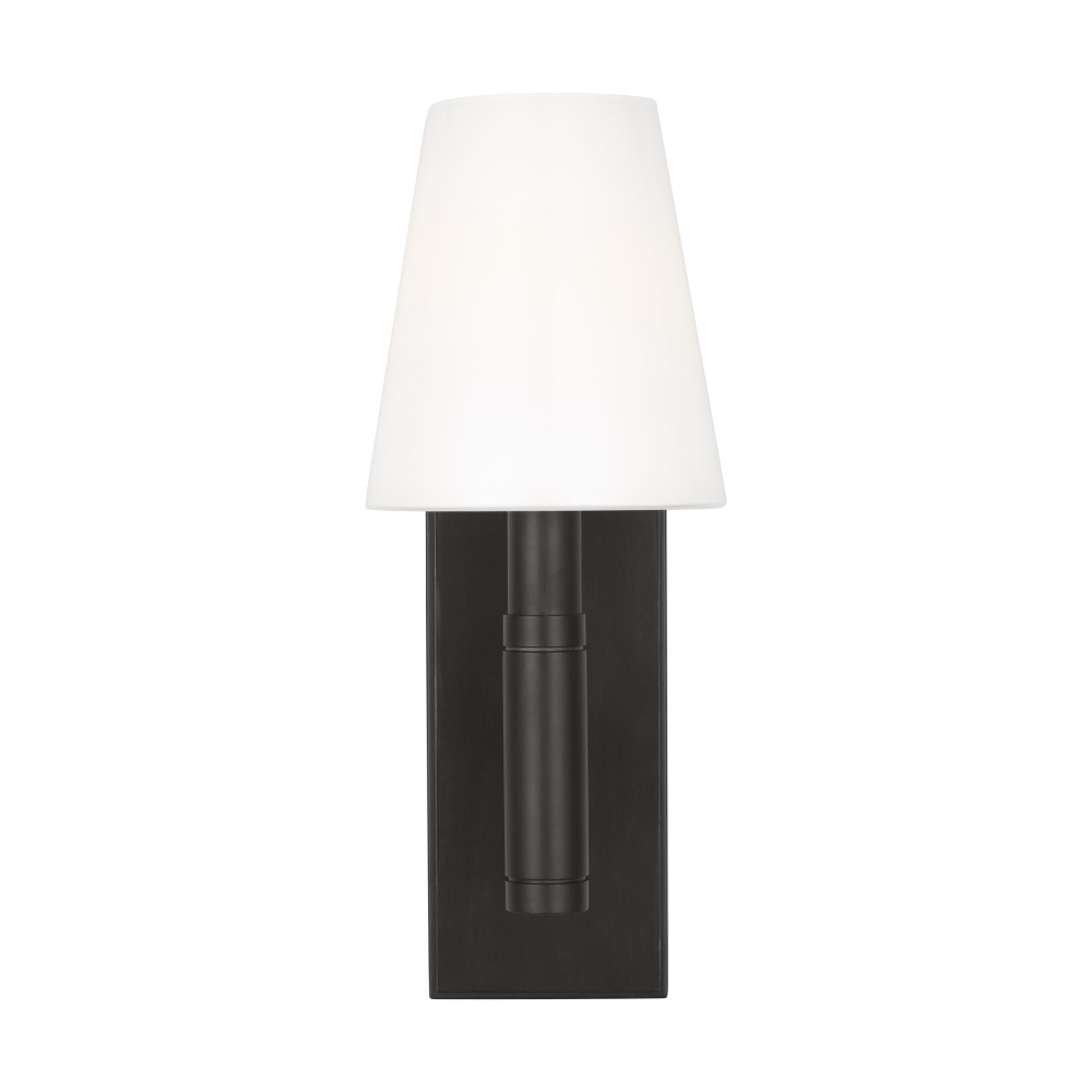 The Beckham Classic one light wall sconce in aged iron provides abundant light for your bath vanity, while adding a layer of today's style to your interior design. Traditional silhouette with modern barrel detail on both the central hub and socket