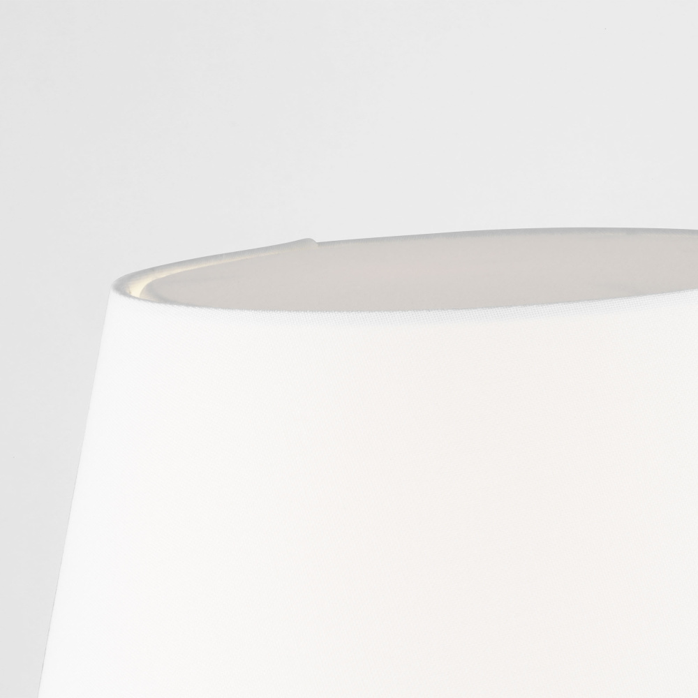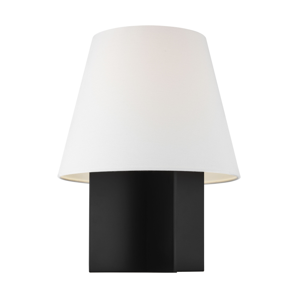 Crafted with Steel in a Midnight Black finish with white linen fabric shade and white linen fabric shade