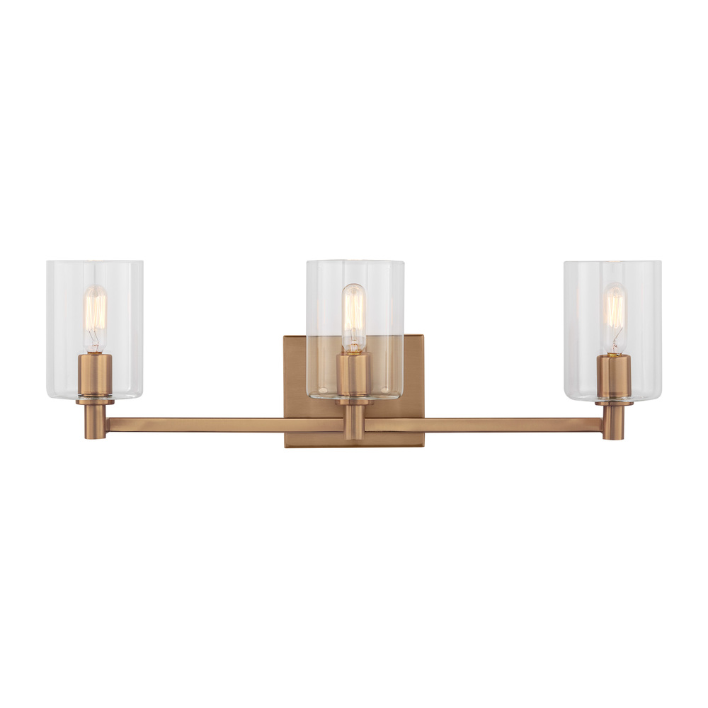 The Fullton three light vanity fixture in Satin Brass is sleek, contemporary, and uber minimalistic. Visual interest is created using a mix of rectangular and round frames, a subtle design detail. Although this collection is contemporary, it can be mixed in with variety of collections with ease.