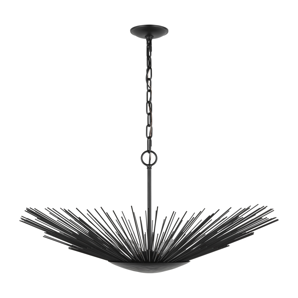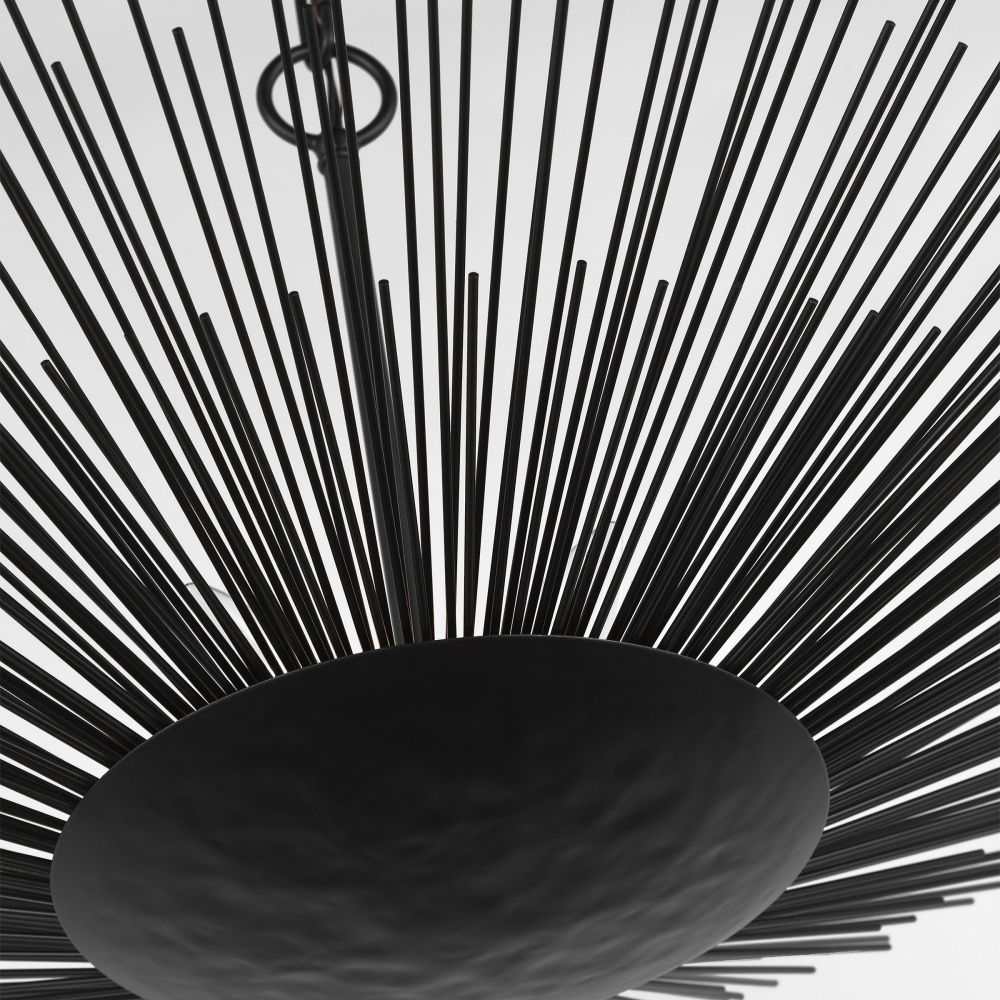 Named after the Greek God of the Sun, the Alexa Hampton Helios series is made with hand-applied gold leaf and then hand-distressed. This Mid-Century Modern fixture takes the shape of its name, with up-flowing stems resting elegantly on a round metal canopy. Straw-like brass layers of hand-cut, hand-welded metal rods form the shade of this textural fixture. The Helios series features a dynamically cut, sun-like form and gilded iron finish. This stunning piece is an eruption of light and brings a stylish presence to any aspect of your space. The assortment included fresh takes on traditional looks, beautiful and unique hand-applied finishes, and stunning, thoughtful-inspired sculptures.